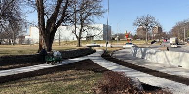New sidewalks have been installed in the pocket park at 45th and Rockhill Road. Thanks to the city for the update to the park.